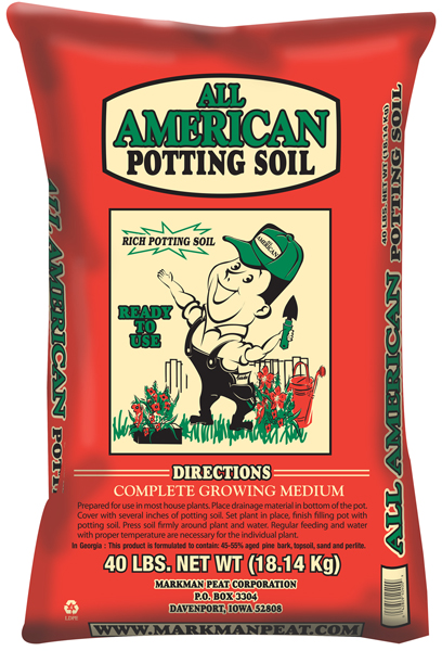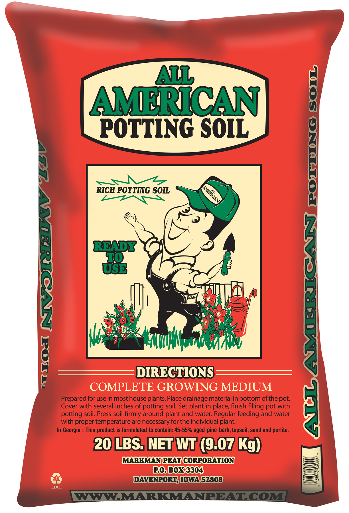 Our dependable All American Potting Soil is available in 40, 20, and 8 lb. bags and is excellent for a complete growing media for most house plants. It is formulated for use in producing vigorous, sturdy plants. It’s great for indoor as well as outdoor containers and planters. To be successful in raising house plants they must have proper drainage, water and fertilizer. Make sure to not overwater your plants. While repotting, to check the plant’s roots, gently hold the plant, turn the pot upside down and tap the rim on a table. If the roots fill the entire mass of soil, the plant needs transplanting to a larger container. In Georgia, this product is formulated to contain: 45-55% aged pine bark, topsoil, sand and perlite.